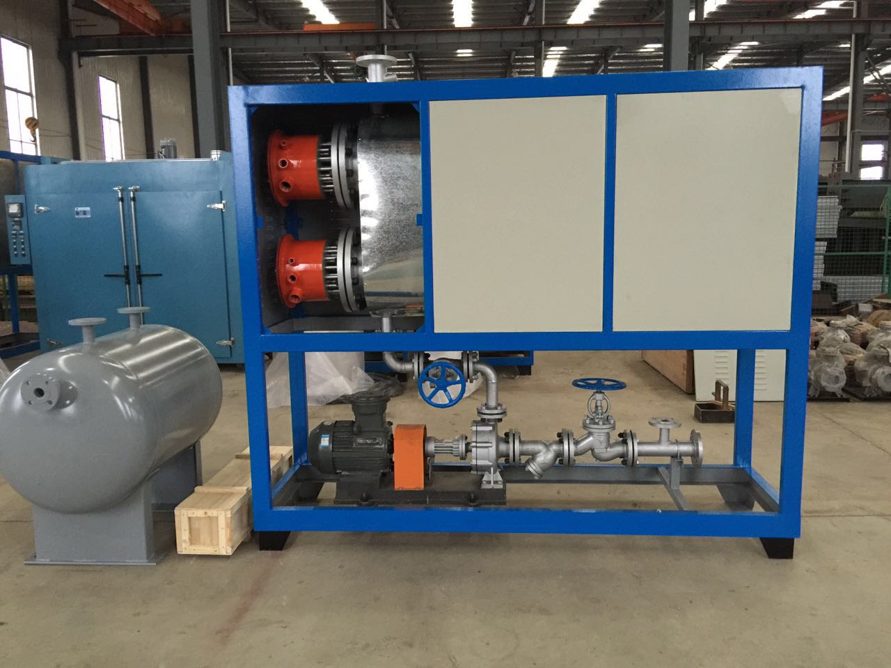 導(dǎo)熱油爐排氣流程: 1、導(dǎo)熱油通過(guò)膨脹槽注油口處加注,并通過(guò)膨脹口管道流入設(shè)備及油爐本體內(nèi),此時(shí)注油時(shí)一定要打開(kāi)系統(tǒng)中所有的閥門(mén)(放油閥除外),讓導(dǎo)熱油流入筒體及需加熱設(shè)備內(nèi)。 2、當(dāng)液面顯示約為膨脹槽高度1/2時(shí),停止注油。 3、首 行常溫排氣:接通電源,打開(kāi)導(dǎo)熱油加熱器的進(jìn)出口閥門(mén)及排氣閥(膨脹管道閥門(mén)需一直開(kāi)著以及時(shí)補(bǔ)充油量),按動(dòng)油泵啟動(dòng)按鈕,油泵運(yùn)行,油泵應(yīng)按箭頭指示方向正常運(yùn)行,壓力表壓力顯示在規(guī)定范圍內(nèi),視聽(tīng)油泵運(yùn)行情況,如有異常現(xiàn)象應(yīng)立即停機(jī)檢查,將故障排除后再重新起動(dòng)油泵,進(jìn)行常溫下排氣,直至壓力表指示穩(wěn)定。進(jìn)行常溫排氣時(shí),要注意觀察膨脹槽內(nèi)的液位,當(dāng)?shù)陀谝?guī)定的液位高度時(shí)要及時(shí)進(jìn)行補(bǔ)充。 4、升溫脫水:在確認(rèn)常溫下運(yùn)行正常后,即可進(jìn)行升溫脫水排氣(操作前詳閱導(dǎo)熱油使用說(shuō)明書(shū)及溫控儀使用說(shuō)明書(shū)),升溫脫水排氣可按如下步驟進(jìn)行: 步:升溫至100-120℃保溫 開(kāi)始升溫時(shí),應(yīng)該控制升溫速度在50℃/h以?xún)?nèi),并且監(jiān)視壓力表顯示是否正常,如發(fā)現(xiàn)無(wú)壓力或壓力不穩(wěn),說(shuō)明系統(tǒng)內(nèi)仍有殘留氣體,此時(shí)要求按3要求重復(fù)進(jìn)行常溫排氣操作,待系統(tǒng)壓力穩(wěn)定后方可繼續(xù),升溫至120℃后進(jìn)行長(zhǎng)時(shí)間保溫,保溫時(shí)間的長(zhǎng)短與系統(tǒng)總?cè)萘考皩?dǎo)熱油的質(zhì)量有關(guān)。  第二步:升溫至150-180℃保溫。  排除油中輕組分、揮發(fā)物及殘余水分,請(qǐng)參照KRD系列導(dǎo)熱油加熱器系統(tǒng)脫水排氣曲線圖操作 第三步:脫水排氣完成后要關(guān)閉排氣閥(其它閥門(mén)無(wú)需關(guān)閉),投入正常升溫運(yùn)行。 5、 升溫脫水排氣過(guò)程有關(guān)事項(xiàng)。 升溫過(guò)程中管路可能會(huì)發(fā)出碰擊的響聲,說(shuō)明系統(tǒng)內(nèi)有大量氣體或管道不暢,此時(shí)要降低升溫速度,待氣體排除便可消除聲響;如系管道不暢所至應(yīng)予以排除。 脫水排氣過(guò)程可能會(huì)有大量氣體涌入膨脹槽,造成槽內(nèi)導(dǎo)熱油外溢,操作前要在溢油管下安置好溢油容器。 進(jìn)行脫水排氣時(shí),現(xiàn)場(chǎng)必須有人員看守,發(fā)現(xiàn)異常及時(shí)處理。   對(duì)于所提的油泵無(wú)油或少許油流出的問(wèn)題,解決方案如下: 1、 關(guān)閉出油口閥門(mén),啟動(dòng)油泵,觀察壓力表顯示情況,若無(wú)壓力,則說(shuō)明回油口無(wú)油補(bǔ)充油泵,使得油泵空轉(zhuǎn),無(wú)后續(xù)油及時(shí)補(bǔ)充,則請(qǐng)貴司檢查一下回油口的供油情況,此時(shí)請(qǐng)確保膨脹槽里有油并膨脹管道閥門(mén)打開(kāi)和需熱設(shè)備有油并出油口閥門(mén)在打開(kāi)狀態(tài)。 2、 如果以上要求都執(zhí)行到位,壓力表還無(wú)壓力,請(qǐng)檢查油爐上的油泵、截止閥及過(guò)濾器是否堵塞。 3、 若壓力表顯示壓力值,而油泵、截止閥及過(guò)濾器并無(wú)堵塞,那油爐的出油口一定會(huì)按油泵所提供的流量進(jìn)行流出。